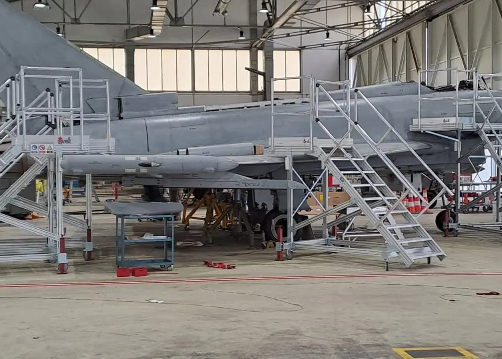 2 Leitern für den Pilotenzugang, mit vorderem Überhang, der dem Profil des Flugzeugs folgt, um direkten Zugang zum Innenraum zu haben und gleichzeitig Wartungsarbeiten an der Rumpfseite durchzuführen.