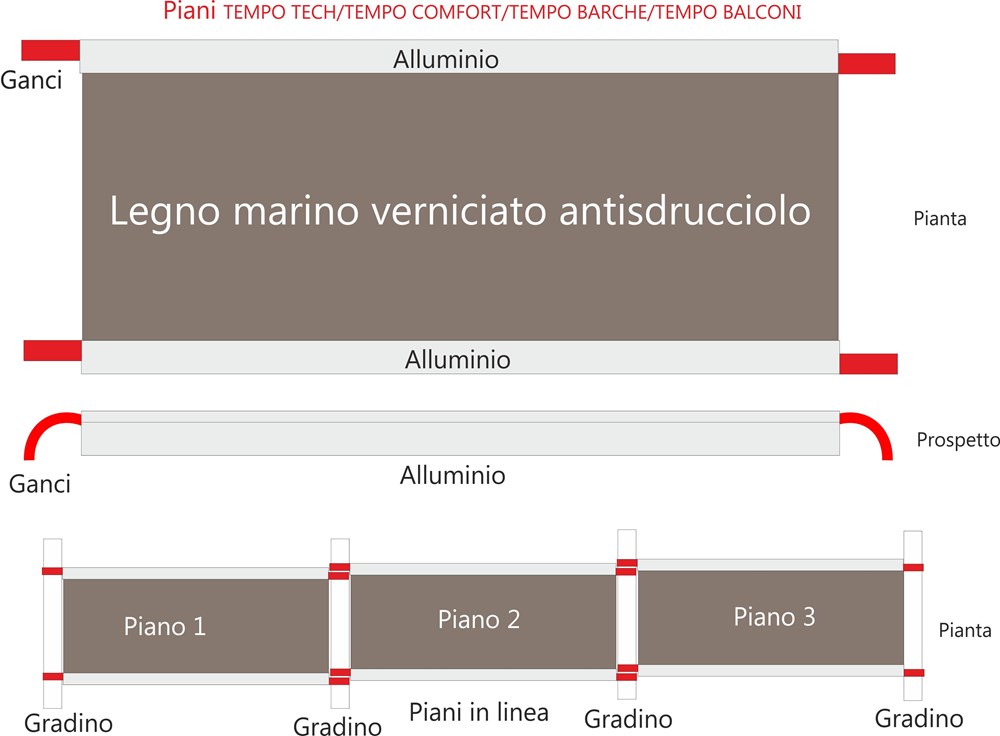 - Plattform mit Aluminiumverstärkung und Belag aus mehrschichtigem Marineholz mit Fußanschlag, Falltür und winddichtem Haken. Das Holz ist lackiert und rutschfest.