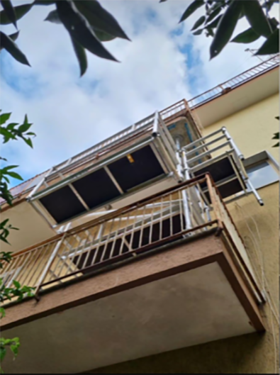 - 4 ausziehbare Teleskopbeine ermöglichen es, die Basis des Gerüstes an der oberen Balkondecke mit 4 Aluminiumplatten gegen den unteren Balkon abzustützen.