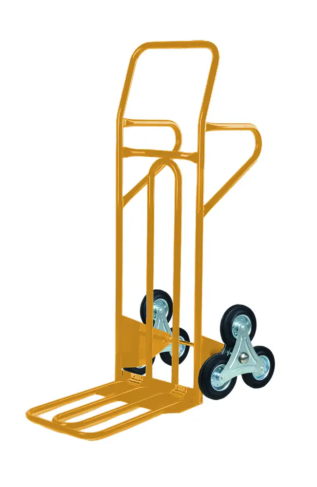 Stahltreppen-Kletterwagen – übergroße Klappplattform. In Italien gefertigte Räder mit Eisennabe und verstärkter Stahlplatten, die für hervorstehende Stufen geformt sind