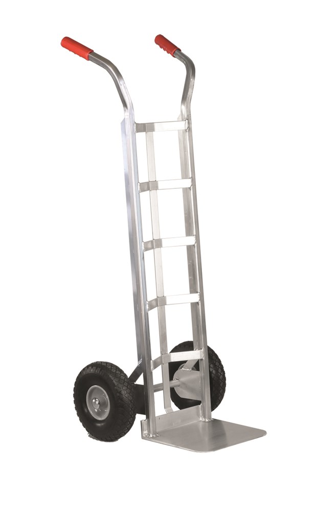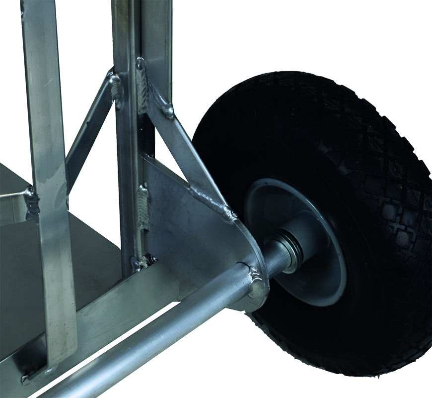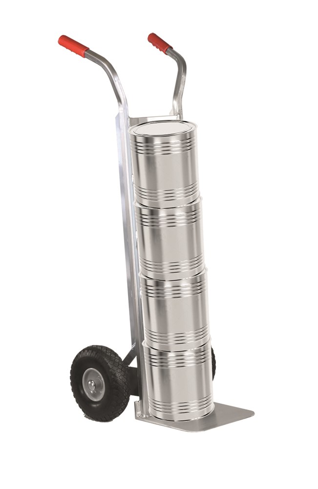 Aluminiumwagen mit ergonomischen Griffen und einer konkaven Struktur, in der Lackdosen und kleine Fässer perfekt untergebracht werden können, ohne dass die Gefahr besteht, dass sie sich während des Transports bewegen.