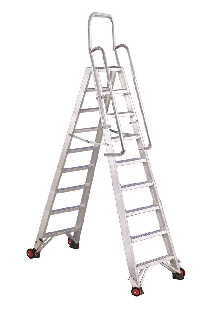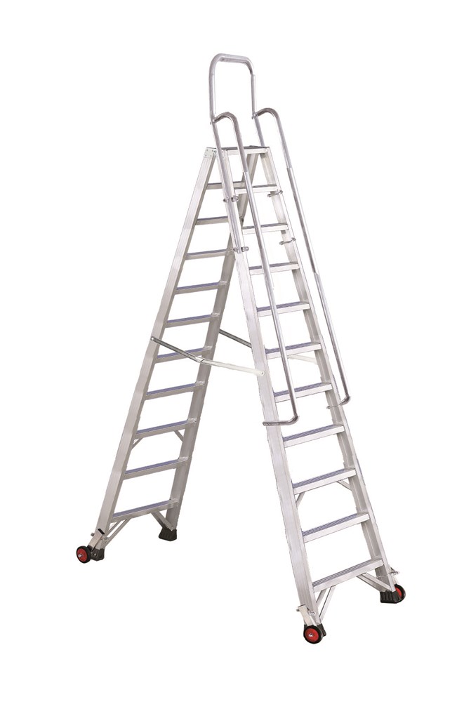 Leiter mit doppeltem Aufstieg, ausgestattet mit ergonomischem Zubehör für Sicherheit und Komfort.