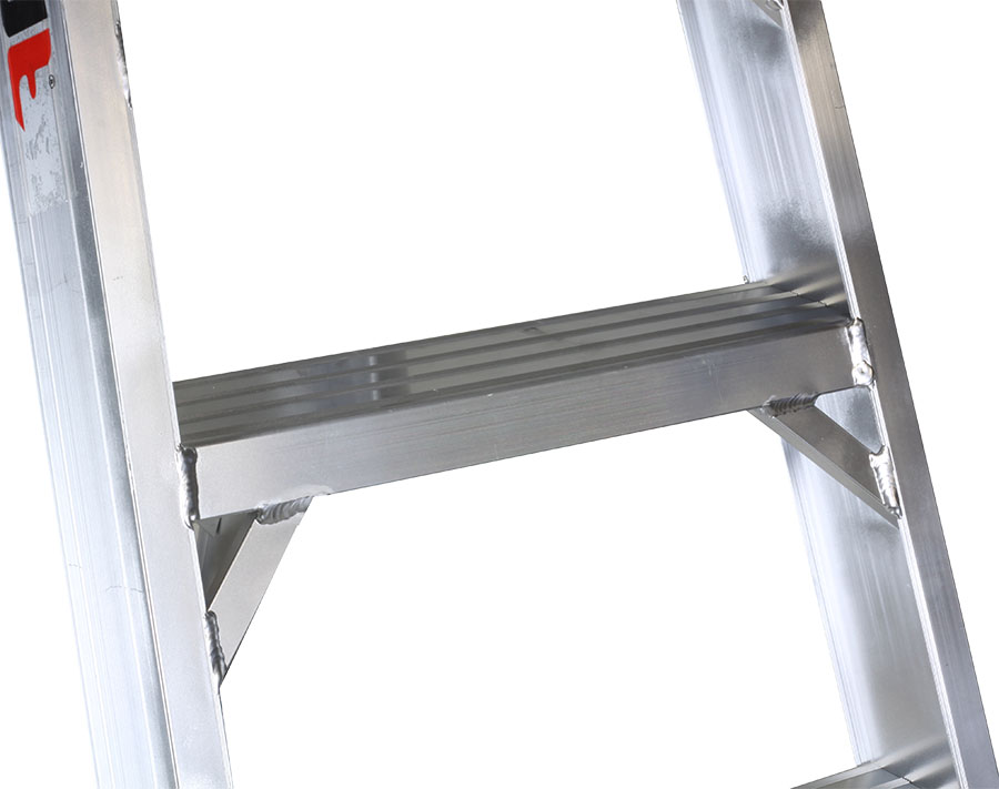 Jede Stufe ist durch 2 zusätzliche verschweißte Stützstangen verstärkt. Das Profil liegt in einem Kasten weist dadurch eine deutlich erhöhte Biege- und Torsionsfestigkeit auf. Ausgestattet mit vergrößerten, ergonomischen, rutschfesten Puffern. Querschnitt der D-förmigen Kastenholmen 80x25 mm.