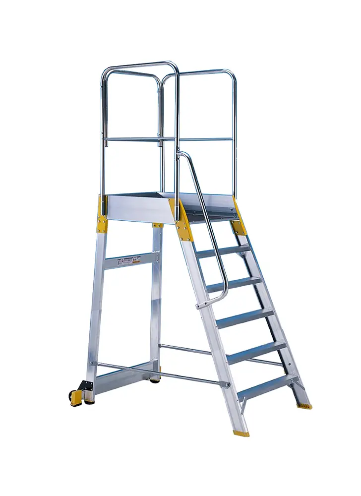 Sie ist aktiv, wenn sich die Leiter in der Arbeitsposition befindet. Sie wird deaktiviert, sobald der Bediener die Leiter anhebt, und kann einfach an den Arbeitsplatz geschoben werden.