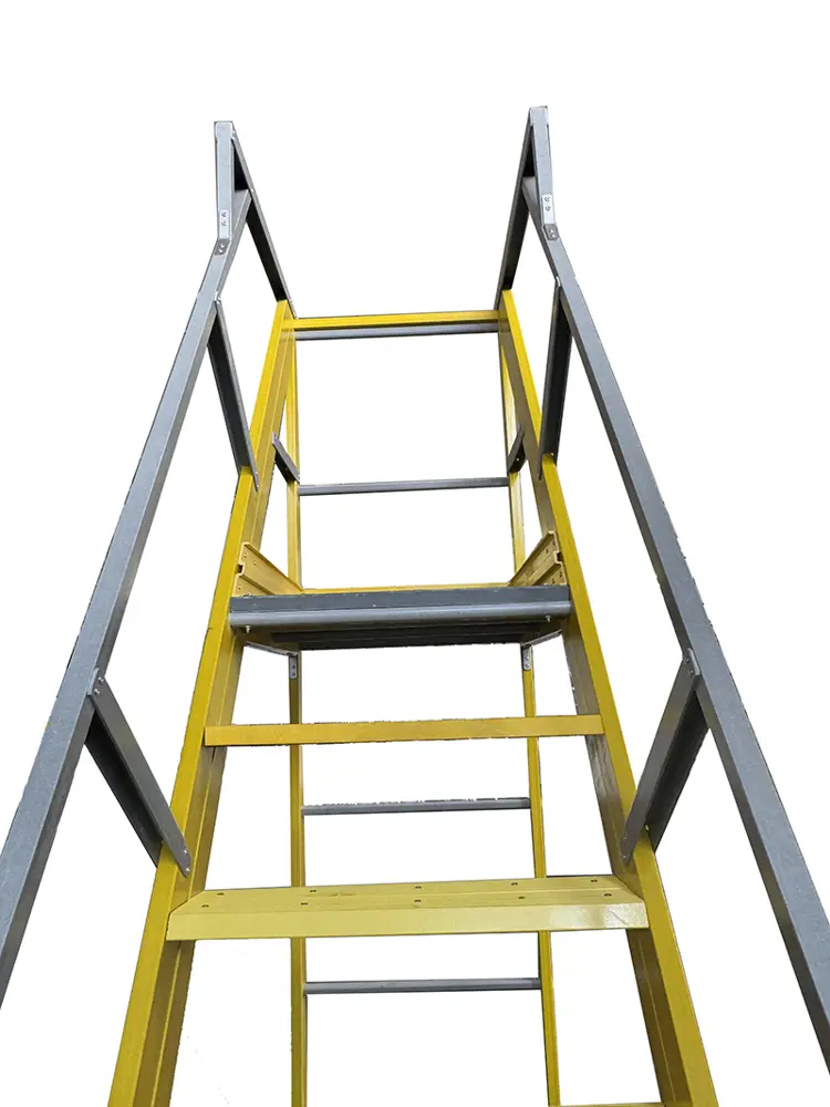 Die große Rampe, der 100 cm lange Brüstungs-Bodyguard und die große 60x80 cm große Arbeitsbühne aus Fiberglas ermöglichen die Verwendung als Etagenleiter.