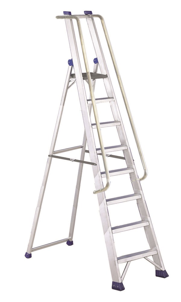 Leiter für den professionellen intensiven Einsatz aus hochfestem Aluminium mit Plattform, Handläufen und Brüstung. Vergrößerte Breite