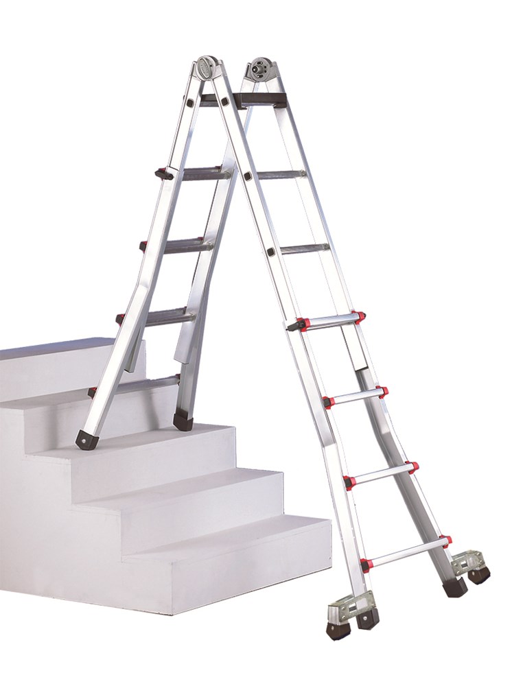 Mit Teleskopauszug kann sie als Teleskopleiter oder als Doppelleiter oder Leiter für Treppen verwendet werden.