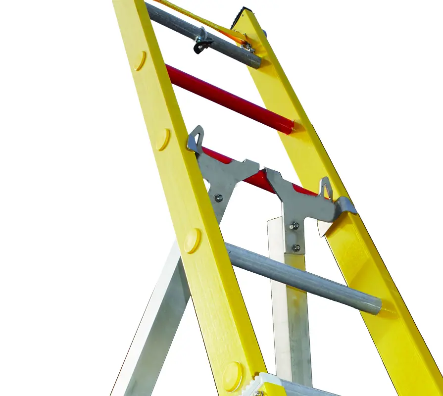 100% isolierender Arbeitsplatz aus Glasfaser (Pfosten/Sprossen). Befestigungsöse für PSA zur Absturzsicherung. Für den Einsatz in offenen Räumen ohne Stütze