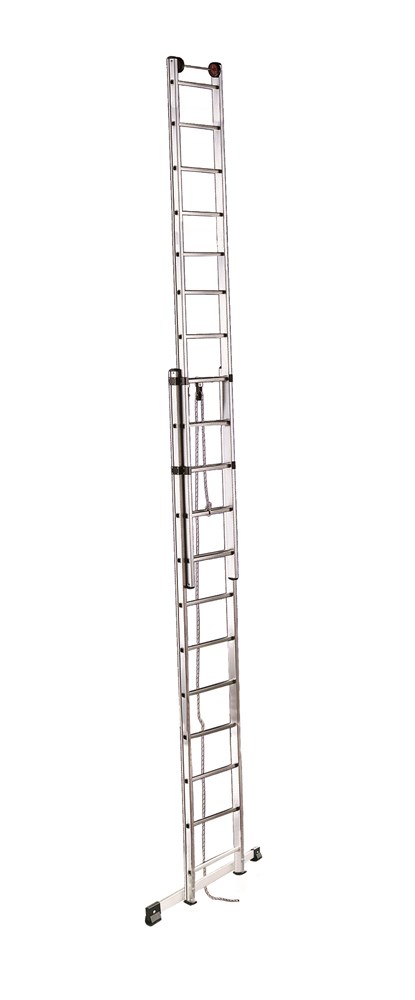 Ausziehbare Leiter in 2 Teilen mit Seilmechanismus, 3. Teil kann von Hand ausgezogen werden, Basisverbreiterungselement. Nach der Europäischen Norm EN131