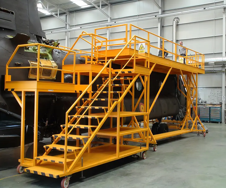 Spezielle Stahl- oder Aluminiumkonstruktionen, die verschiedene Gehwege in unterschiedlichen Höhen für die Wartung oder den Bau von Hubschraubern bilden.