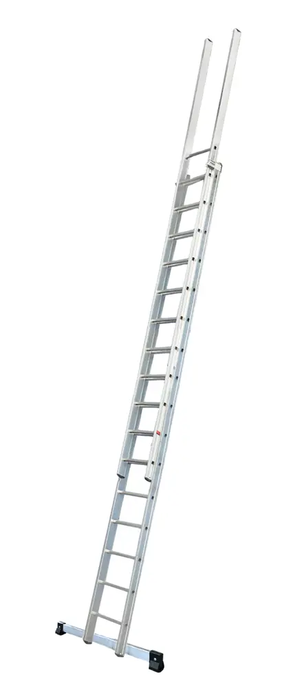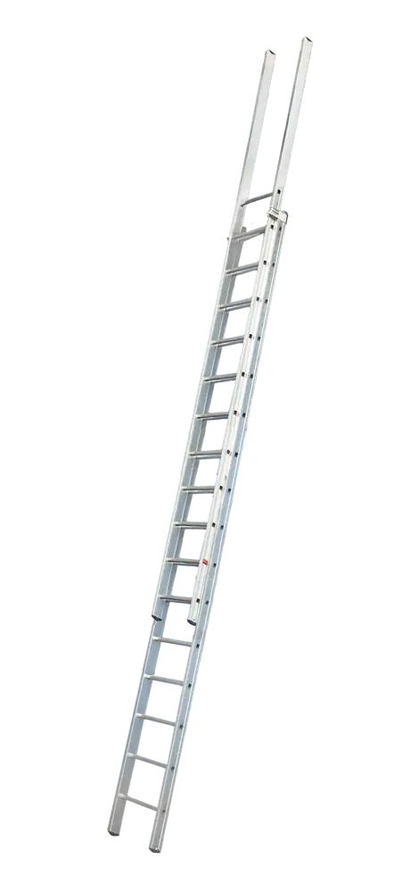 Zweiteilige Teleskopleiter für den Zugang zu Dächern, Zwischenebenen und Zwischengeschossen. Sie zeichnet sich durch den Schutz des Oberkörpers aus, der 1 m über der letzten Stufe herausragt, sodass die Bediener sicher aussteigen können.