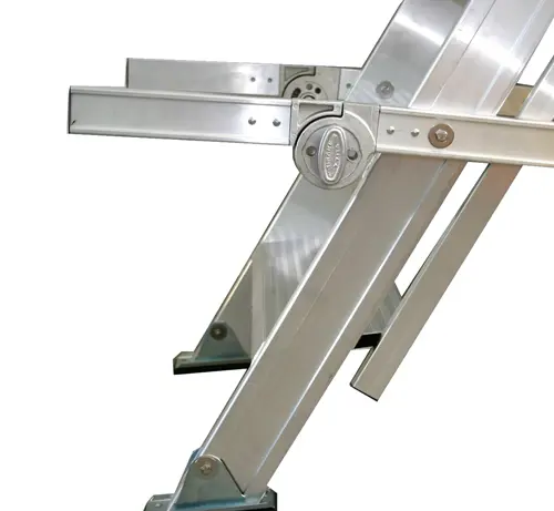 Sobald die Leiter mit den speziellen Griffen für die Handhabung angehoben wird, werden die Anschlagplatten angehoben, so dass die PVC-Räder auf dem Boden gleiten können.