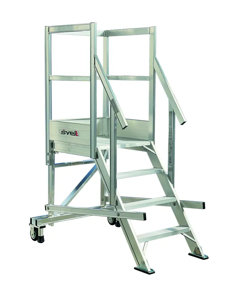 Feste, nicht klappbare Leiter, ausgestattet mit einer 60x70 cm großen Plattform, einem Personenschutz und einem 1 Meter hohen Handlauf.