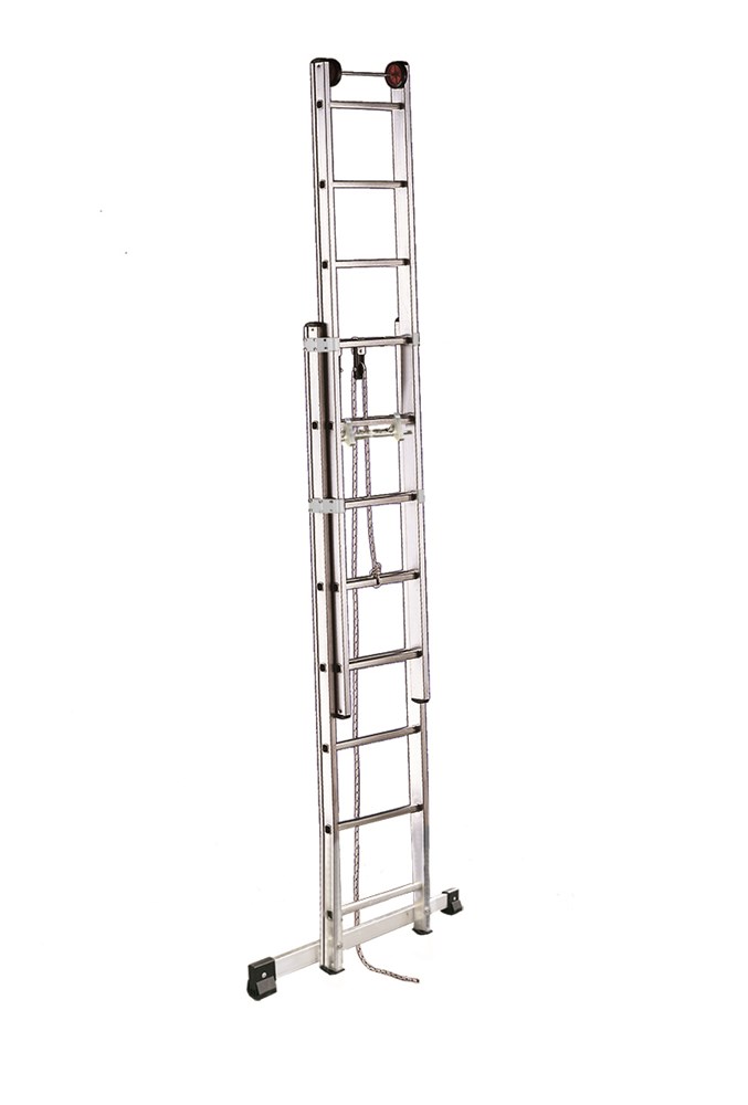 Two-section push-up ladder with rope, equipped with sliding wheels and pulley for rope control, No. of rungs from 2x8 to 2x16