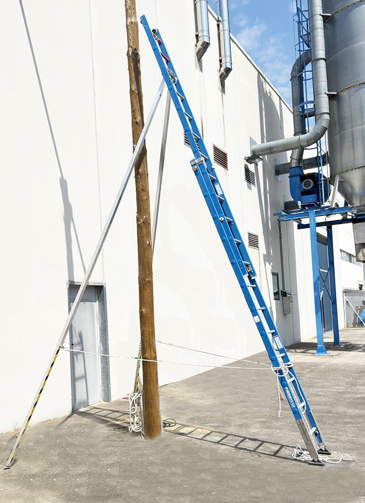 Workstation. Self-supporting ladder in insulating fiberglass with certified hook for the untifall device. For use on wooden posts only