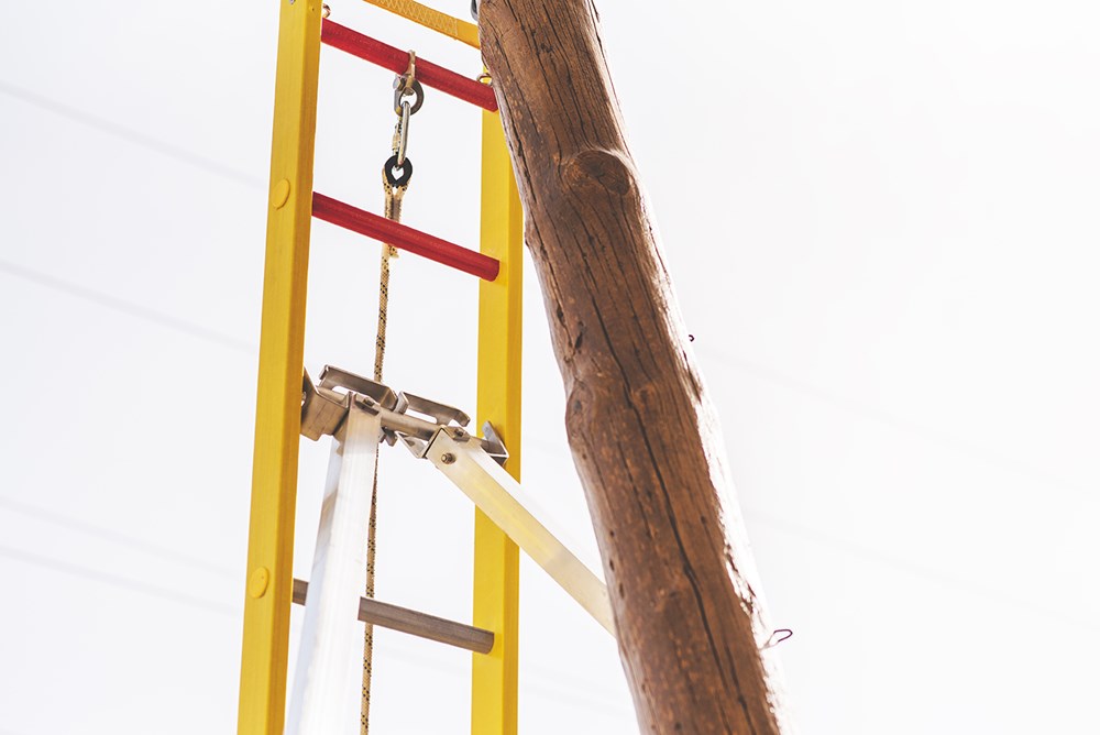 The ladder must never be rested or connected to the wooden pole and is self-supporting.
