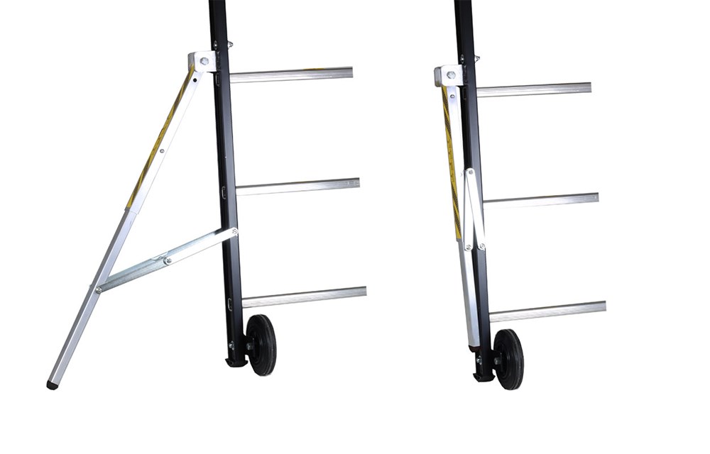 Made of fiberglass for intensive use with 2 wheels, handrails, platform and foldable base stabilizers