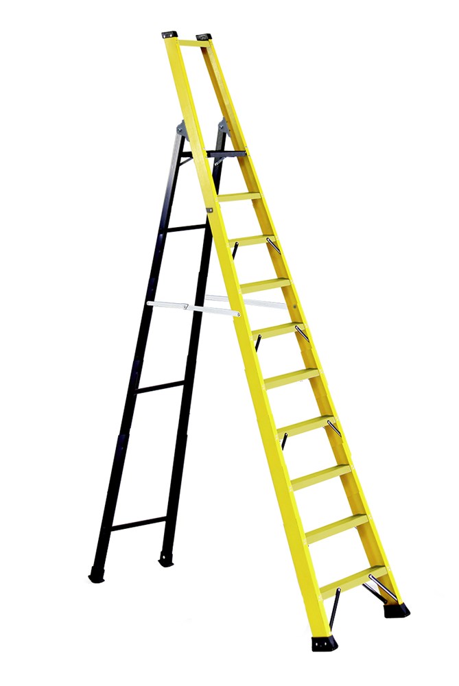 These are stpladders with 100% fiberglass non-slip frames and steps, for professional use, built by riveting the steps to the frames with 8 rivets per step.