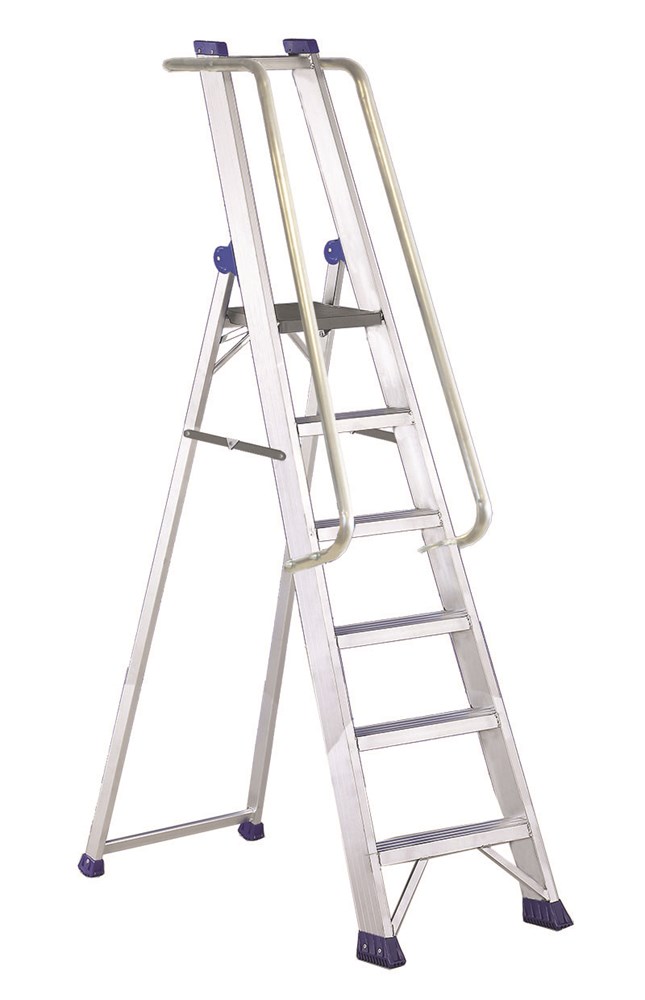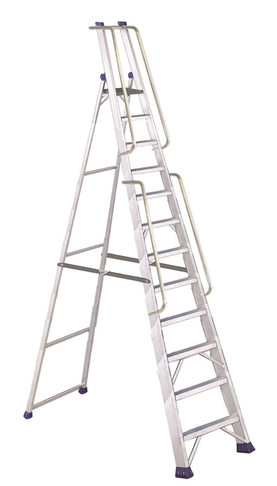 High resistance aluminium large stepladder with platform, guardrail and handrails, designed for intensive professional use, guardrail height cm 60