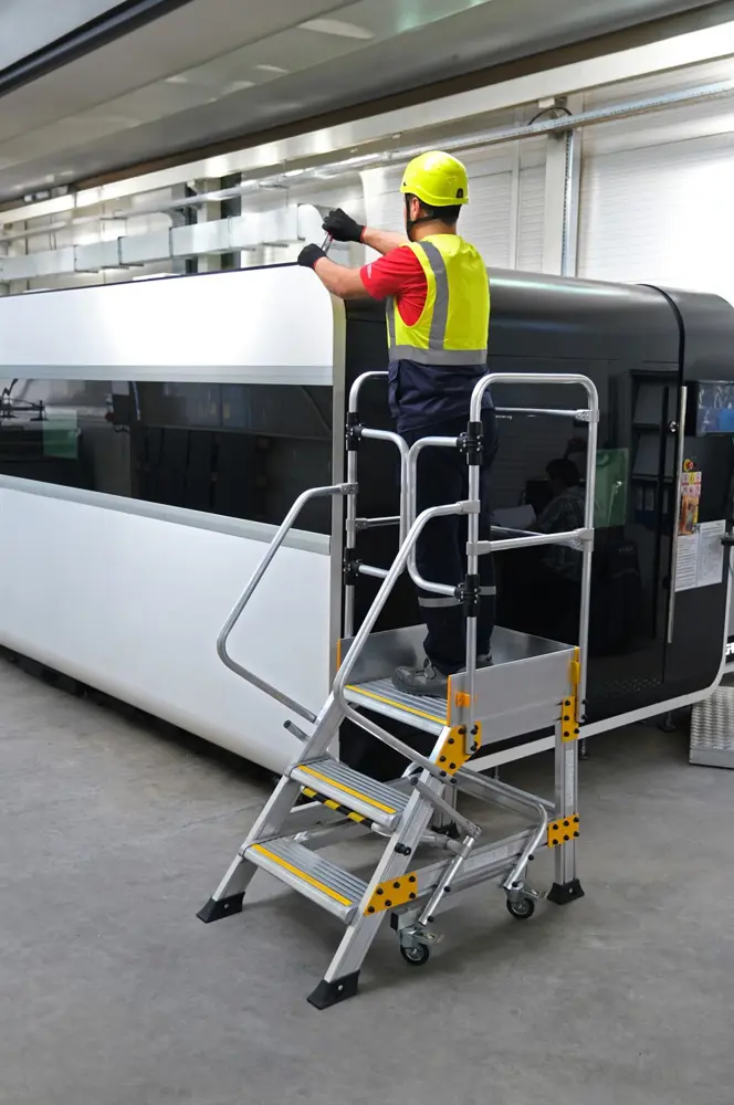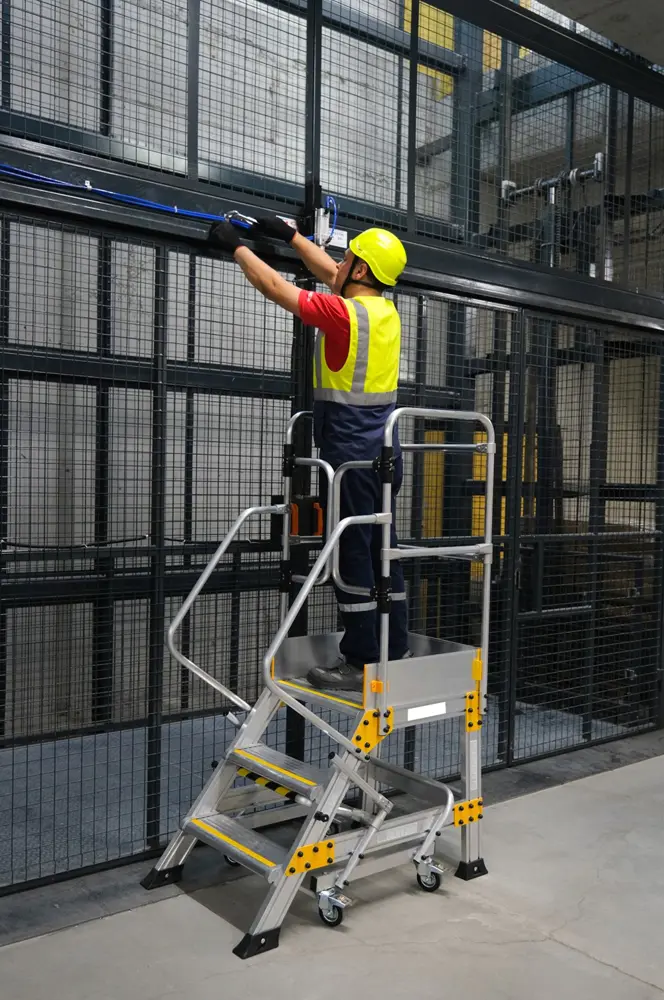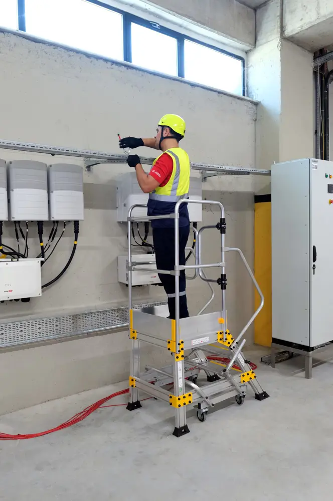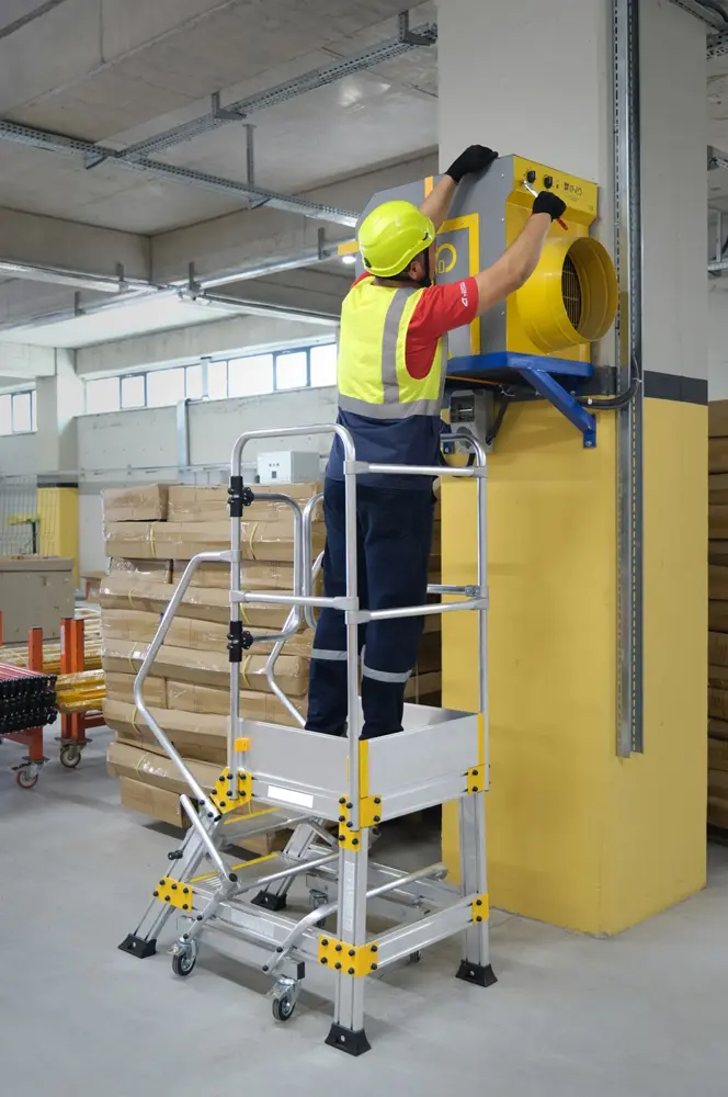 When the lever trolley is deactivated, the feet of the ladder rest on the ground and make the stool stable and ready for the operator to climb.