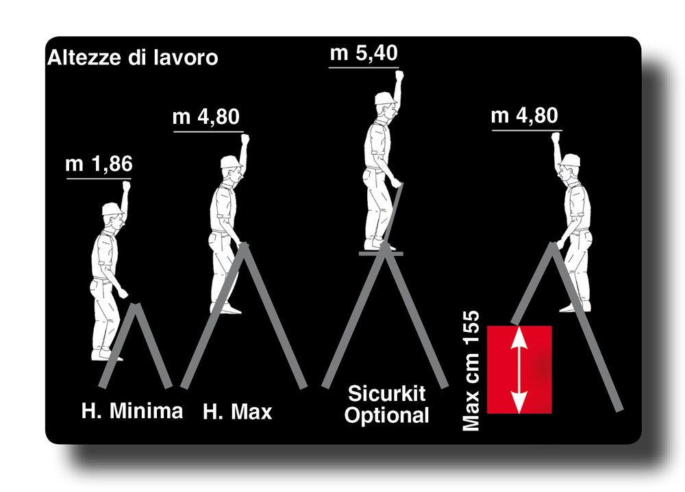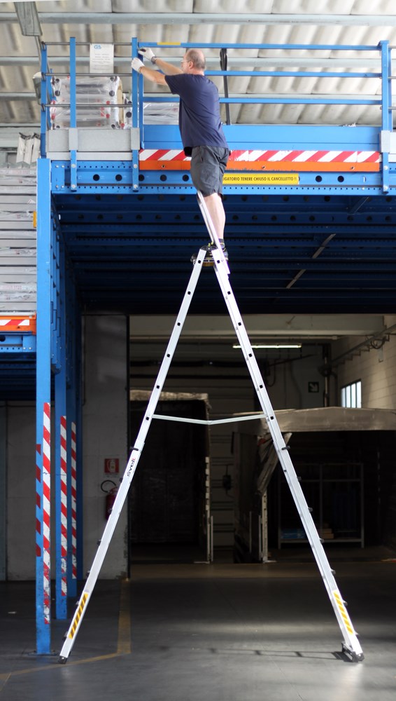 Double sided professional aluminium A ladder, which can reach a working height of almost 5 meters and 5.4 meters with the optional safety guardrail/platform Sicurkit.