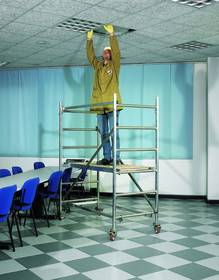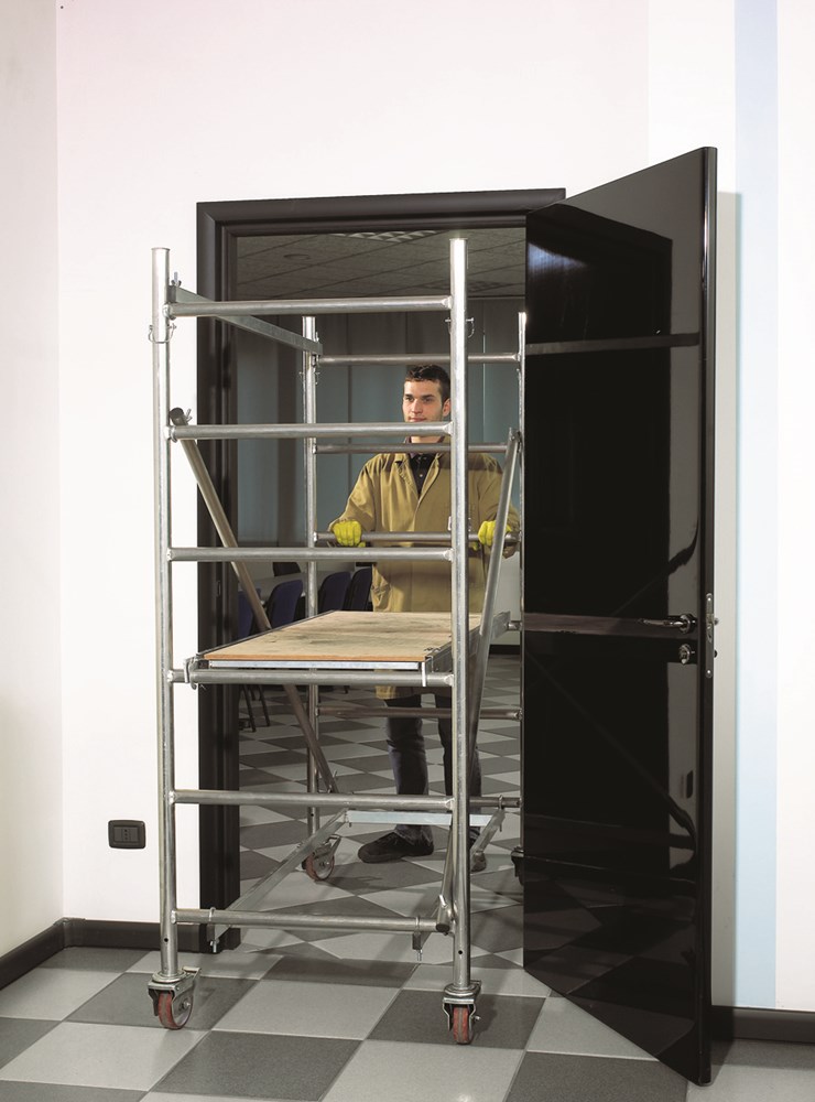 using only 12 components (32 kg), erected in few minutes the base module can be opened at 1,95 m and is suitable for indoor use (it passes through standard doors 1,60 x 0,80 m) and allows a working height of 3,00 m.