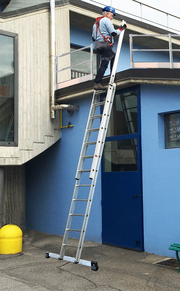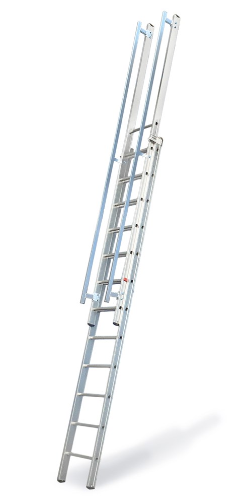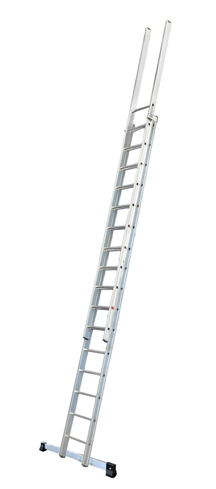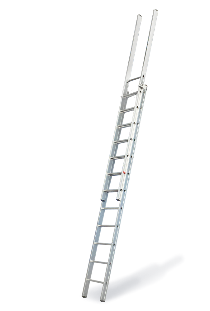 Two-section telescopic ladder for access to roofs, mezzanines and mezzanines. It is characterized by the protection of the upper body that protrudes 1 m. above the last step, so that operators can disembark safely.