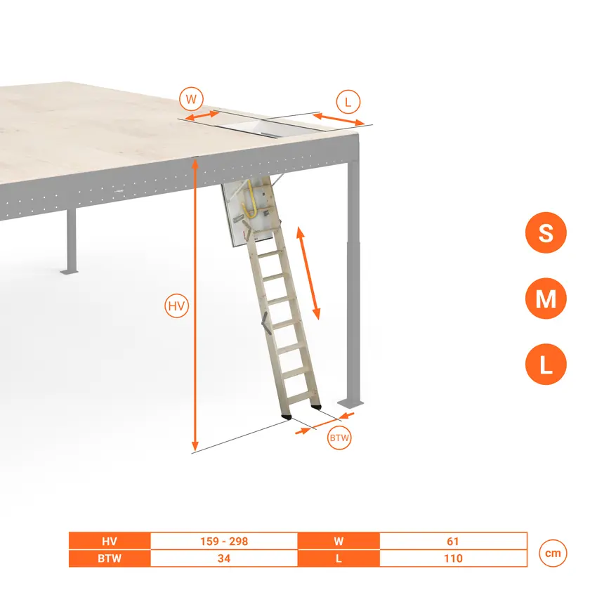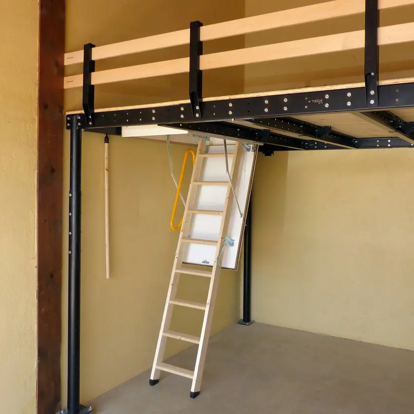 Retractable wooden ladder that facilitates convenient and safe access to the upper side of the mezzanine or the structure in which it is located.