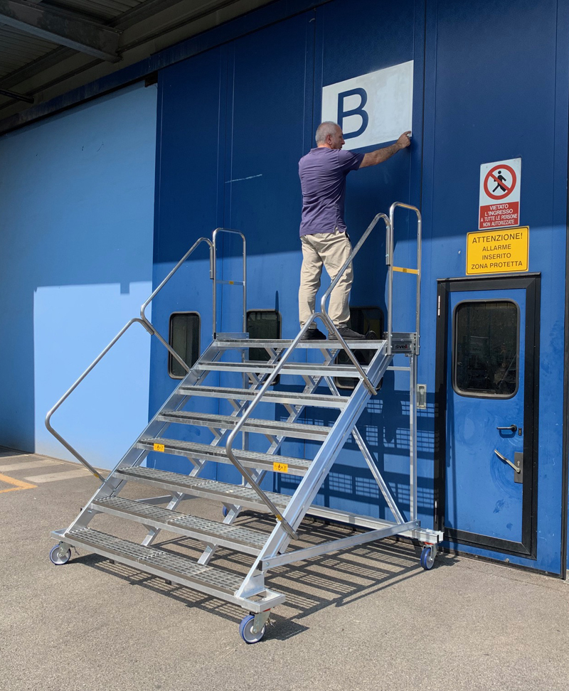 Professional single-sided stepladders suitable to access and maintain machineries, vehicles or loading platforms, the platform can be equipped on request with railings on 2 sides (for front landing) or on 3 sides, the operator can go up with "hands free" and go down even with the front facing the landing.