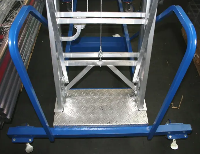 Aluminium platform with toe clip, knee protector and protective parapet with front or side opening and landing gate (on request)