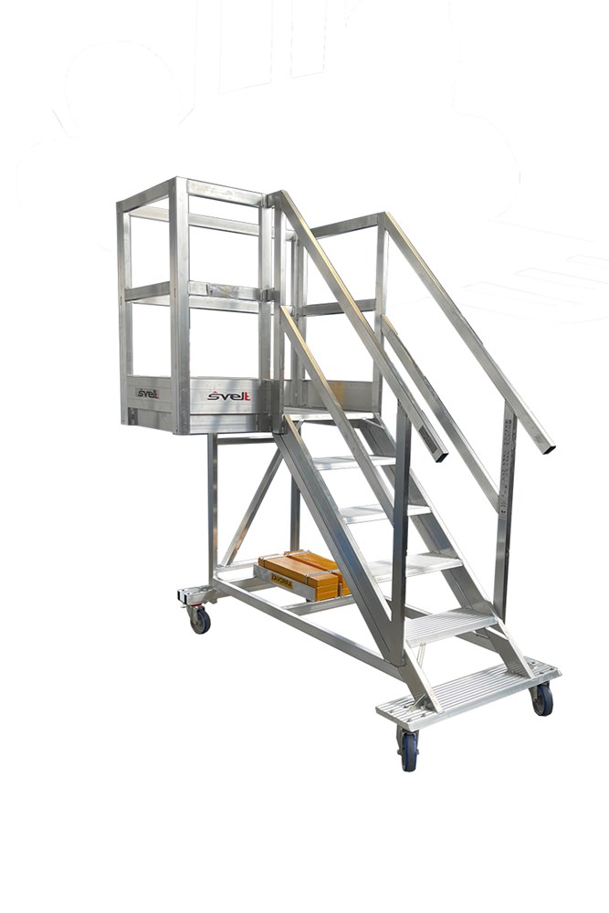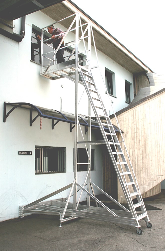 Custom-made movable ladder equipped with 60x70 cm platform, bodyguard and 1 meter high handrail.