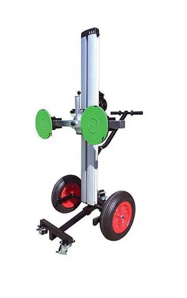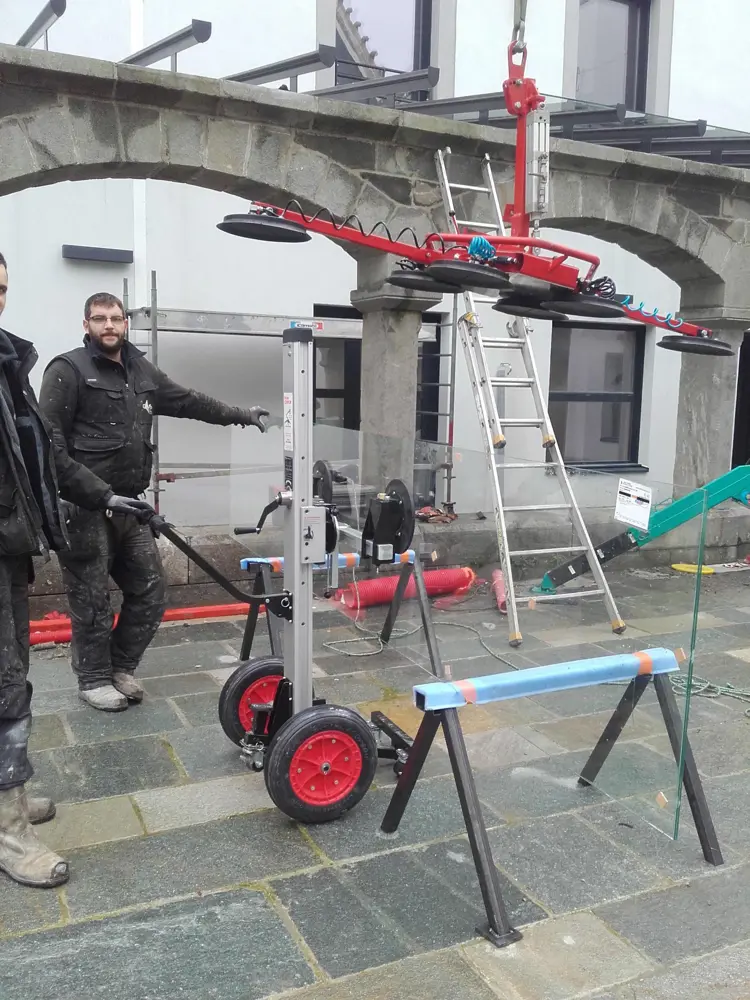 Transportable, compact glass lifter, can be assembled in a few minutes, easy to transport, manually elevated.