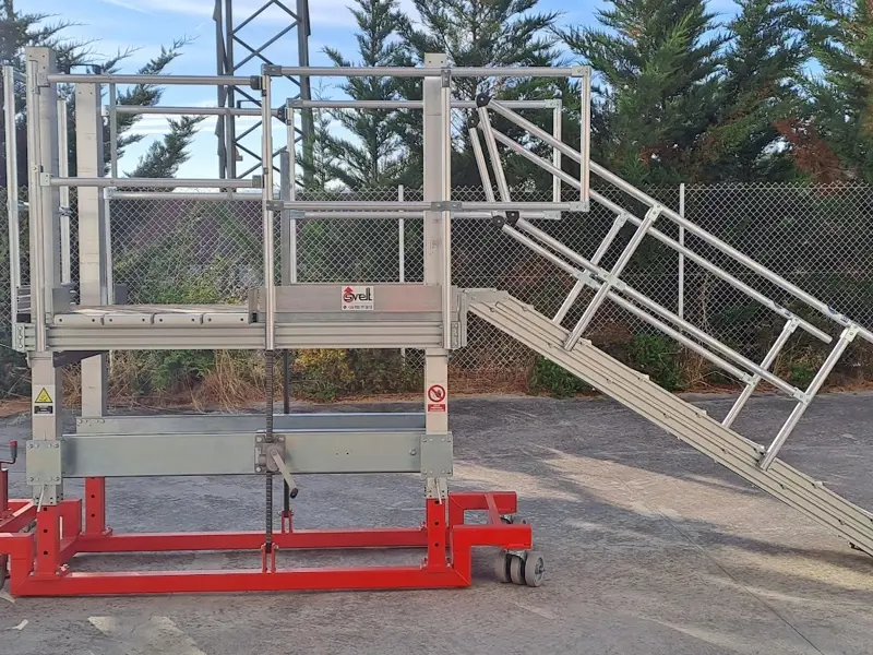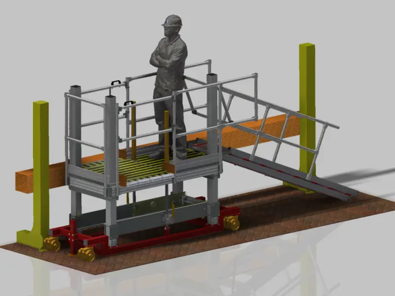La regulación que se nos pidió fue la mínima de 10000mm y la máxima de 2000mm. Para realizar un acceso seguro y cómodo, se incorporó una escalera con paralelogramo, que variaba la inclinación en función de la altura de la plataforma, pero siempre dejando los peldaños paralelos al suelo y poder subir y bajar con herramientas en las manos.