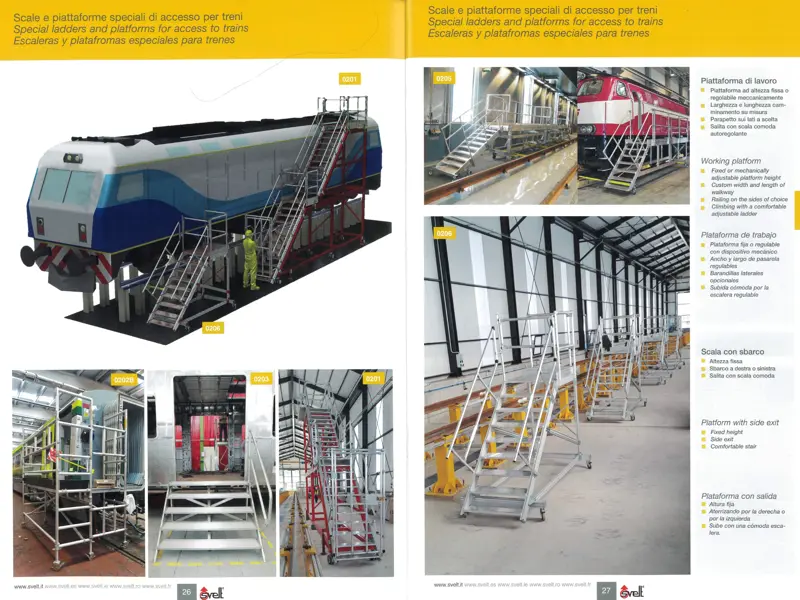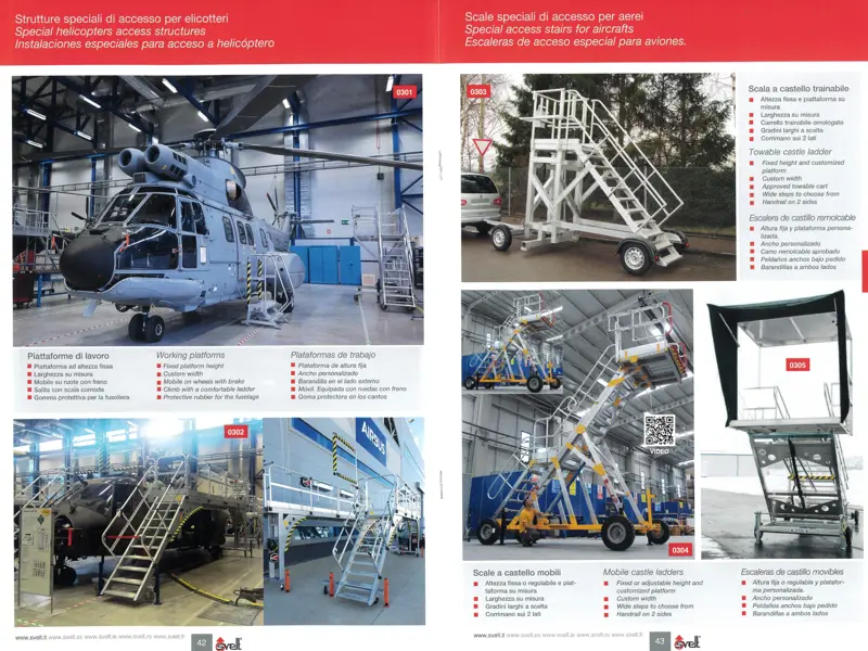 El catálogo incluye una amplia gama de equipos diseñados a medida, como plataformas de acceso, escaleras especiales, estructuras modulares y gradas con elevación elctrica. Estas soluciones están concebidas para garantizar la máxima seguridad y eficiencia, adaptándose a las exigencias particulares de cada sector y cada trabajo. Desde estructuras para el mantenimiento de aeronaves hasta soluciones para la reparación de trenes y barcos, Svelt demuestra su capacidad para innovar en entornos especializados.