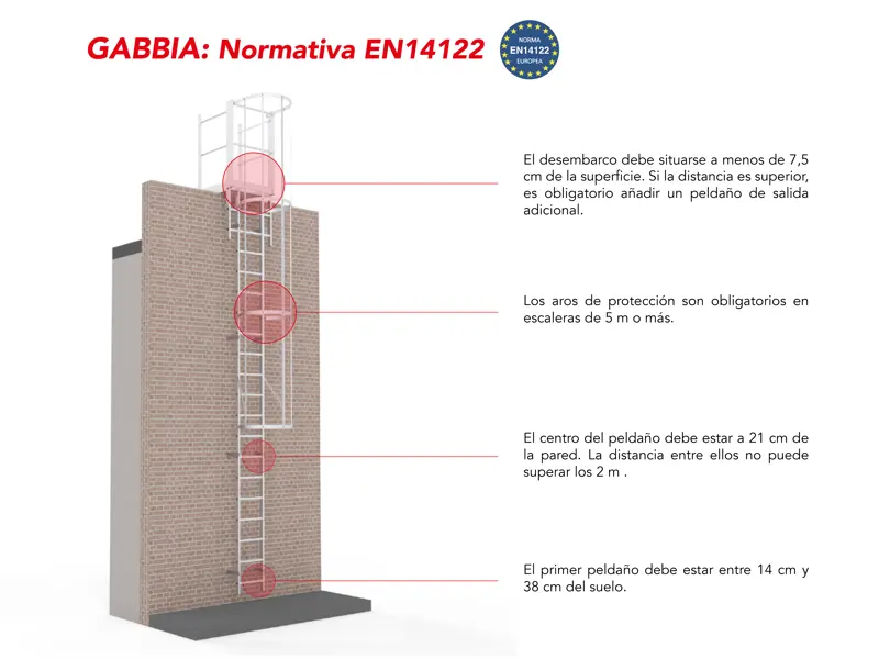 4. Aros de protección: En escaleras de 5 m de altura o más, los aros de protección son obligatorios y deben comenzar a una altura del suelo entre 2,20 m y 3,00 m.