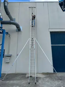 Ejemplo de escalera EURO E2F de aluminio profesional de SVELT y el nuevo accesorio FERMASCALAUNIV2 para fijar la escalera a un murete, a una valla publicitaria o a un canalón metálico revisado y en buen estado de conservación.