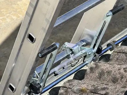 Lo primero es equipar la escalera con los accesorios de sujeción para evitar su deslizamiento. Pueden estar ya instalados en el propio tejado para tener previsto un acceso seguro con escalera portátil, o deben instalarse en la escalera y, desde el suelo, fijarla en la parte superior y colocar un freno en la parte inferior, como esta alfombrilla de material plástico portátil que se ajusta a los estabilizadores.