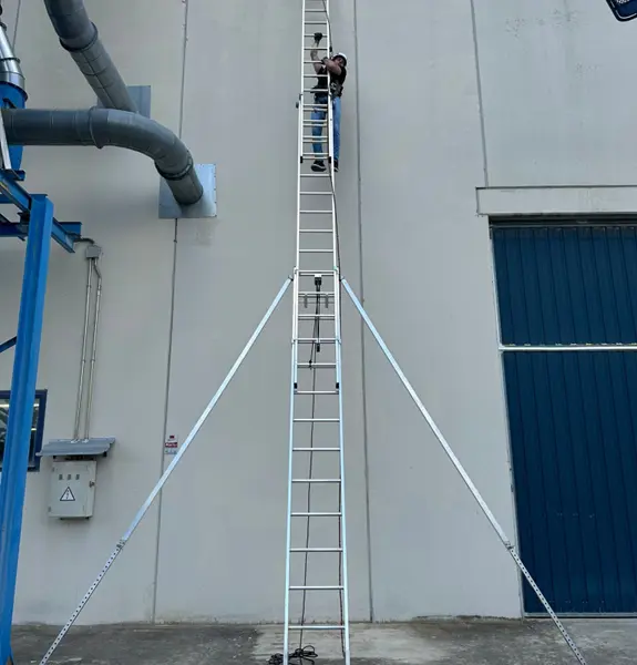 Ejemplo de escalera desplegada en fachada de aluminio con soportes estabilizadores, refuerzos diseñados y testados por el fabricante SVELT para dar soluciones de acceso a cubiertas con escaleras de mano de uso profesional y personal cualificado y formado.
