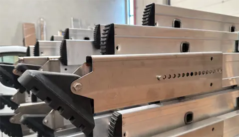 Estas escaleras de 2 y 3 tramos de aluminio suelen llevar patas regulables para desnivel y, por tanto, es obligatorio el uso de las barras estabilizadoras laterales.