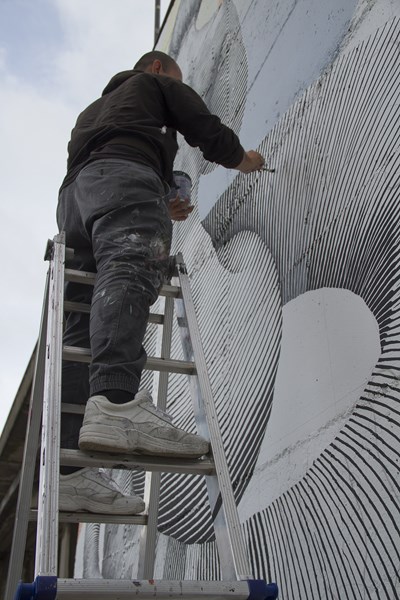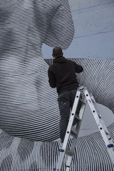 El artista ALFALFA dándole volumen a una de sus pinturas desde una Escalísima Plus. Foto: Mira Hacia Atrás
