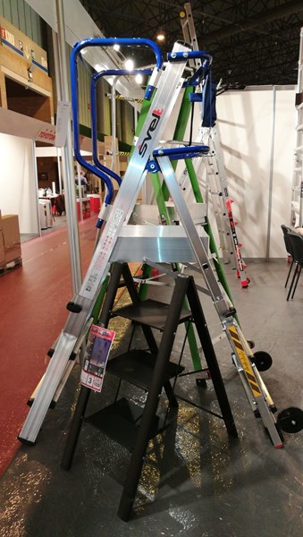 De características similares, pero en fibra de vidrio, se presentaba Stadium como una de las novedades más llamativas del stand de Svelt. Esta escalera de peldaño ancho en fibra de vidrio y con plataforma con rodapiés, guardacuerpos de 360º y barandillas, representa todo un icono de seguridad para el gremio de los eectricistas que pueden trabajar con las mejores condiciones de seguridad y en un entorno aislado.