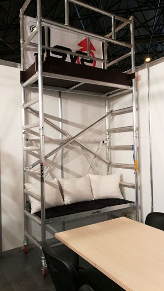 Otro de los protagonistas del stand de Svelt fue el andamio modulable Roller Plus S, que incorporando una plataforma más, quedaba reconvertido en un espacio de reunión ideal para los gerentes y sus clientes.