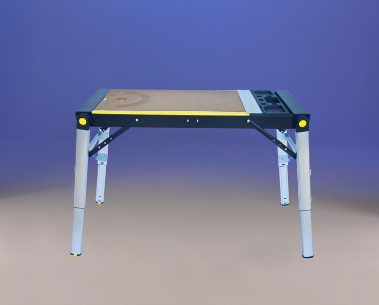 Como banco de trabajo, con toma de corriente y bandeja portaherramientas. Incluye además un tablero de cartón piedra con transportador de ángulos y metro incorporados.