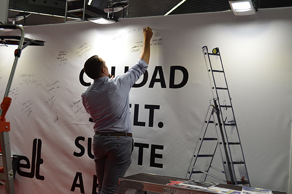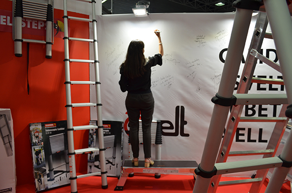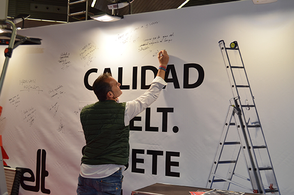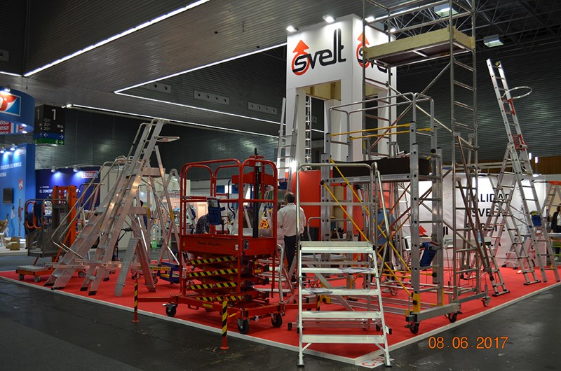 La imagen corporativa debe estar presente en todo momento tanto en las lonas que cubren los paneles como en la parte más visible del stand. Svelt colocó sus logos en la parte alta de una torre diseñada especialmente para apoyar sus escaleras y para dar visibilidad al logo, de forma que se nos viera desde la entrada al pabellón.