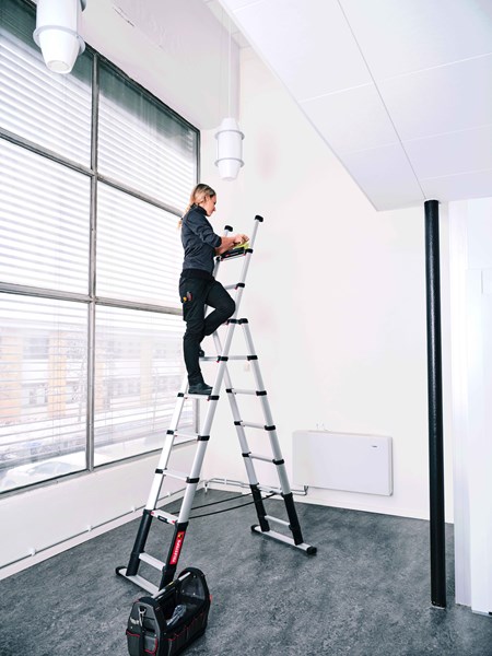 Por un lado Combi Prime es una escalera de tijera ultracompacta telescópica para trabajar en tijera y en apoyo a pared , que incorpora por primera vez perfiles triangulares mucho más resistentes a la torsión y de mayor durabilidad.