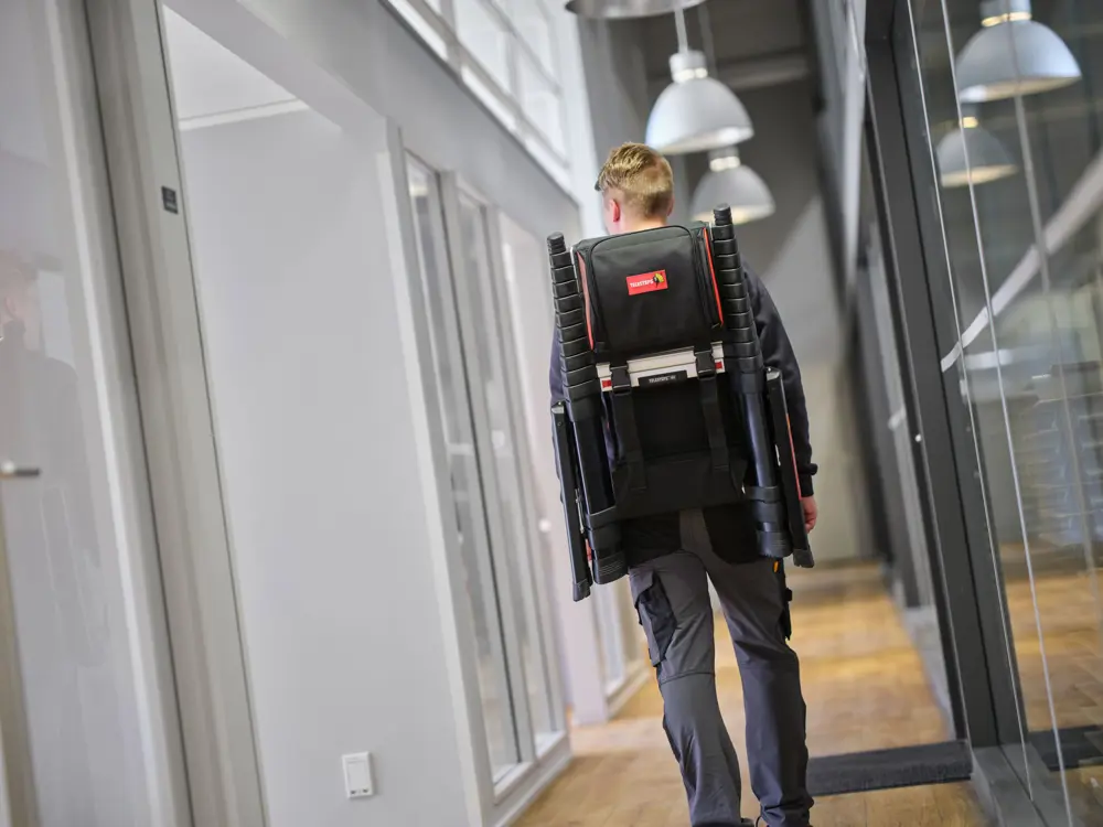 Backpack es fácil de usar. Basta con desabrochar los tirantes para levantar la escalera, manteniendo la mochila porta-herramientas siempre en posición y al alcance.