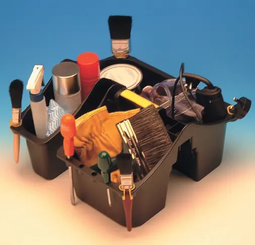 Portattrezzi universale per scale, per uso professionale e per il “fai da te”, costruito in PVC, facile da utilizzare e montare.