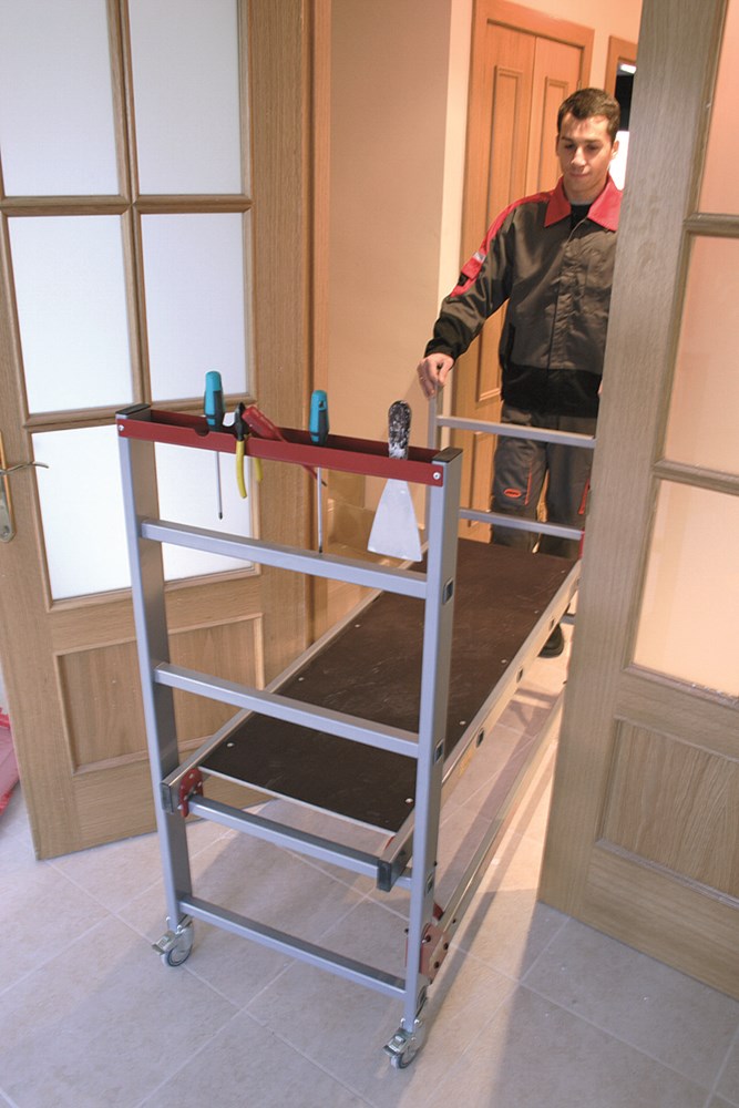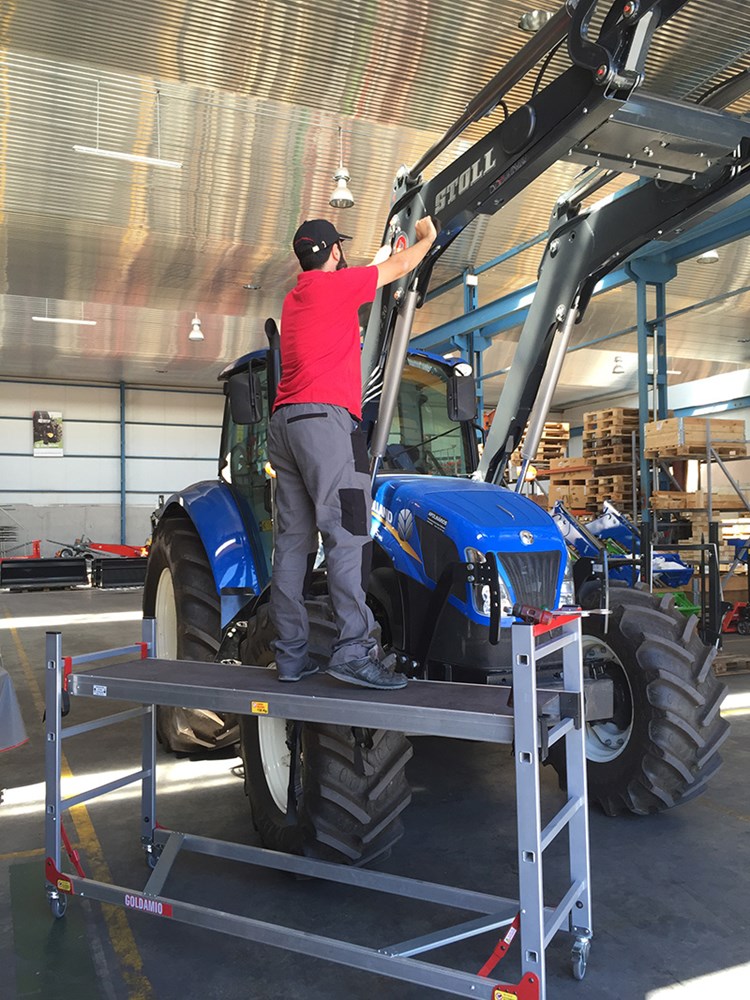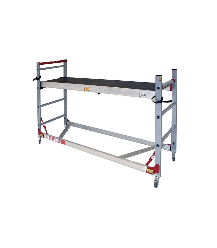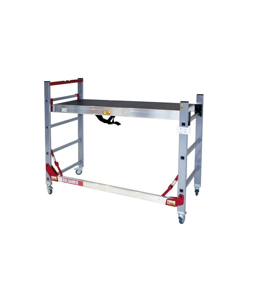 Goldamio es un medio auxiliar móvil de trabajo para uso doméstico y profesional. Construido en aluminio y disponible en tres tamaños. Equipado con 4 ruedas pivotantes con freno. Fácil de plegar y provisto de cintas de amarre incluyendo la plataforma, para llevar desde la furgoneta al lugar de trabajo rodando. Su amplia plataforma proporciona una superficie de trabajo segura.