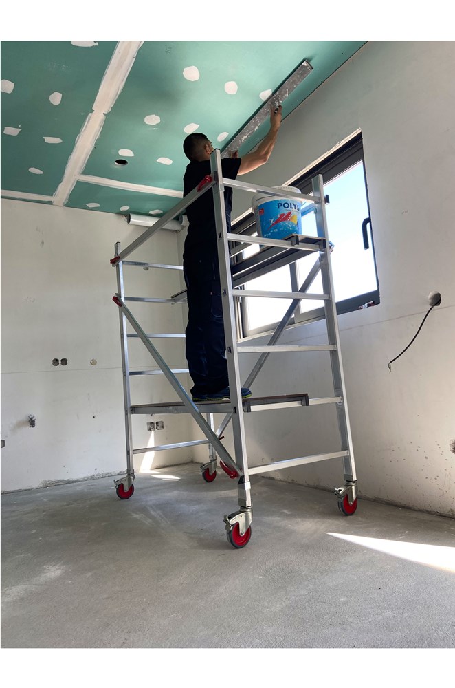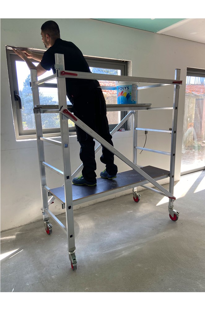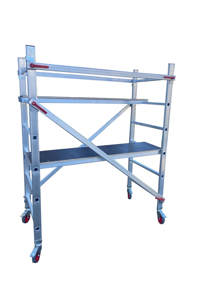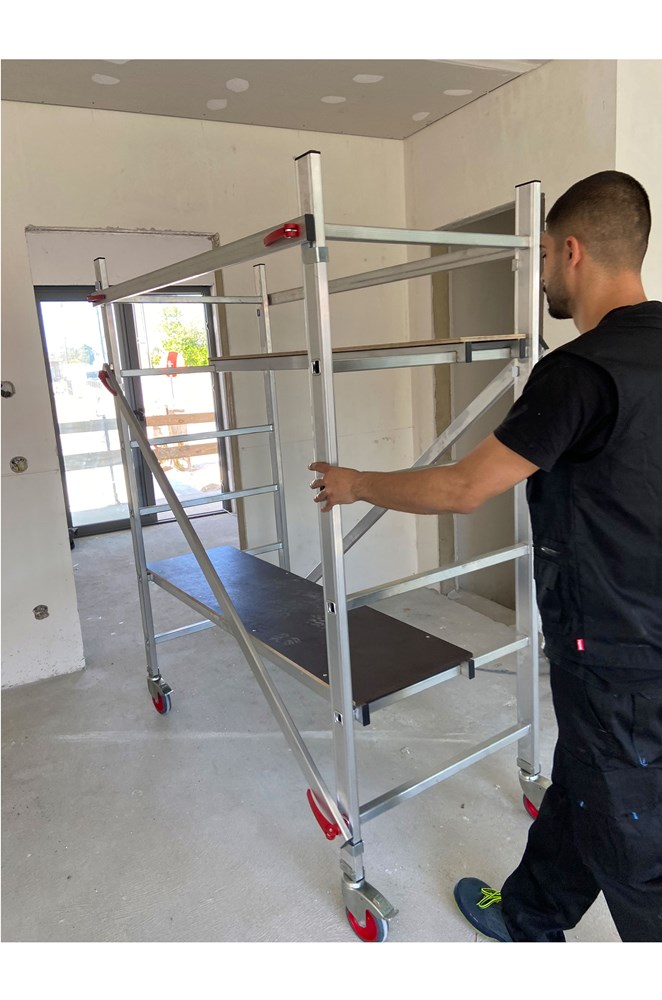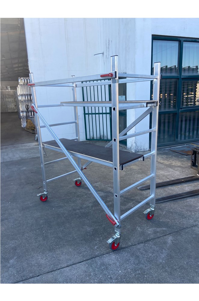 Andamio móvil de aluminio con 3 posibles alturas de trabajo, hasta un máximo de 3 m de altura de trabajo.