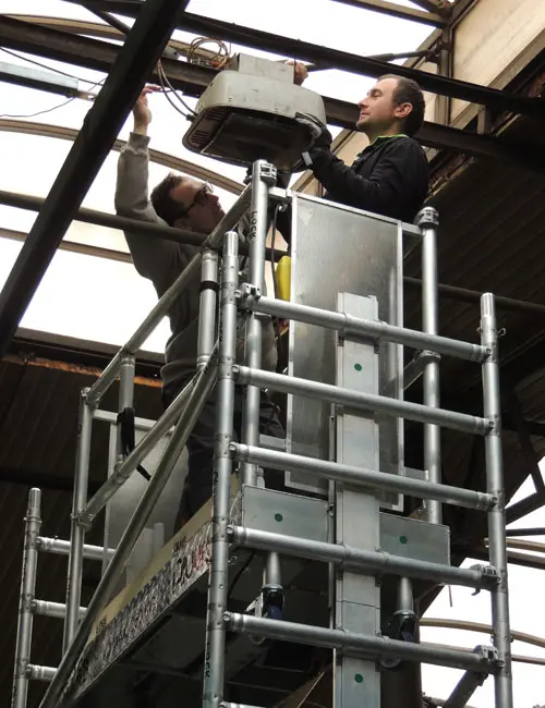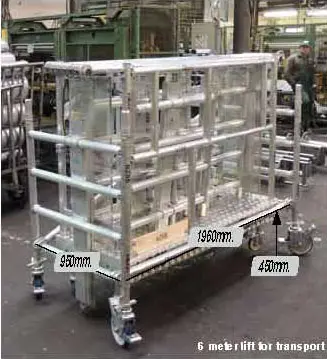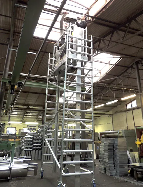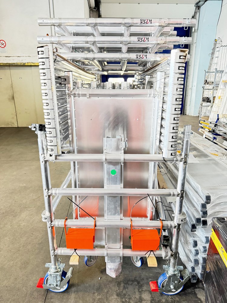 Fácil montaje y transporte: gracias a su plataforma móvil, el tiempo de montaje es más rápido, cómodo y seguro que en un andamio standard. El operario puede montar el andamio elevándose gradualmente desde la parte inferior gracias a su plataforma de empuje eléctrico. Montaje sin necesidad de herramientas.